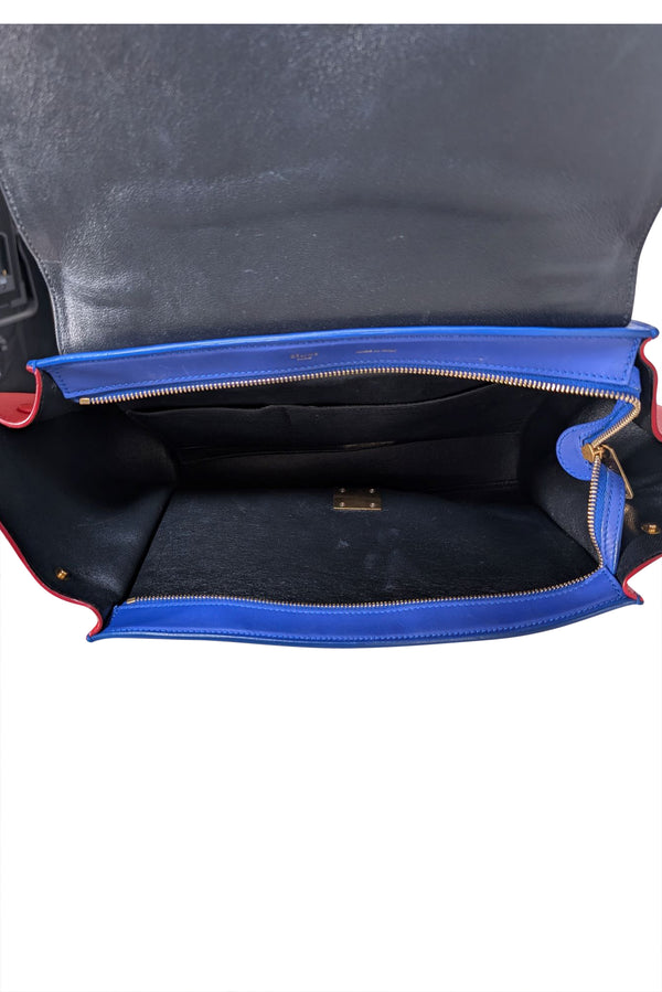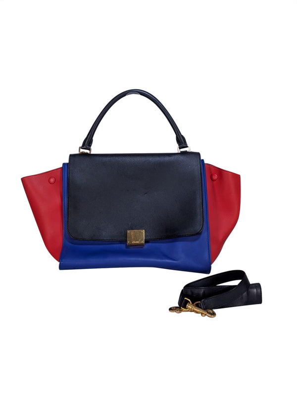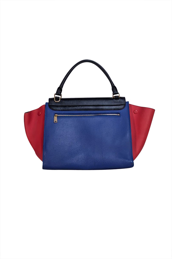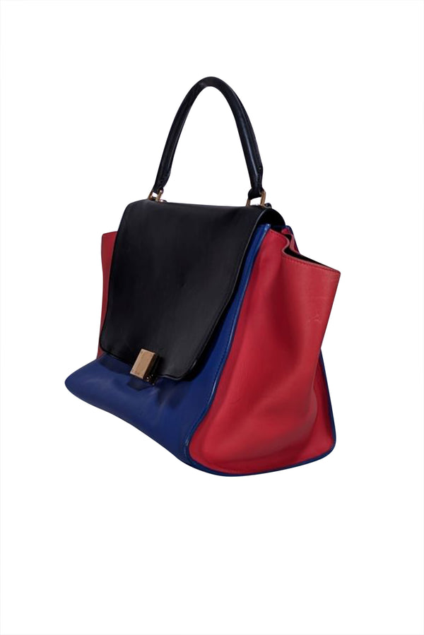 The Celine Trapeze Satchel Bag combines sophisticated style with everyday practicality. Crafted in a striking colorblock design featuring black, blue, and red, this structured satchel makes an instant statement in any professional setting. The trapeze silhouette offers a modern take on the classic work bag, with clean lines and refined proportions. Perfect for the office, client meetings, or weekend errands, this bag transitions seamlessly from work to after-hours. The bold color palette adds personality without sacrificing sophistication, making it an investment piece that elevates your everyday rotation.