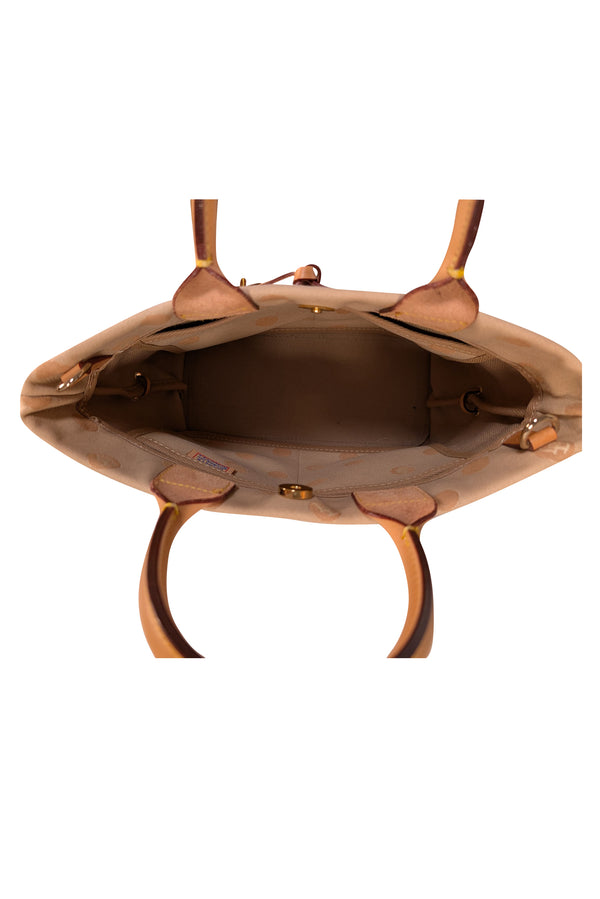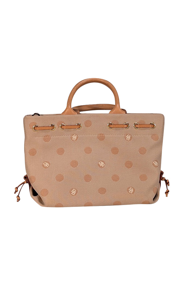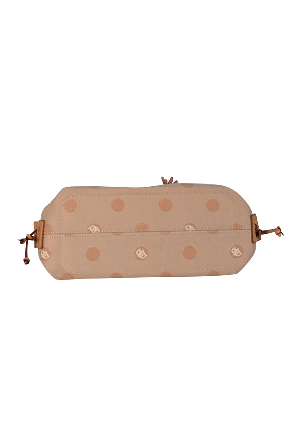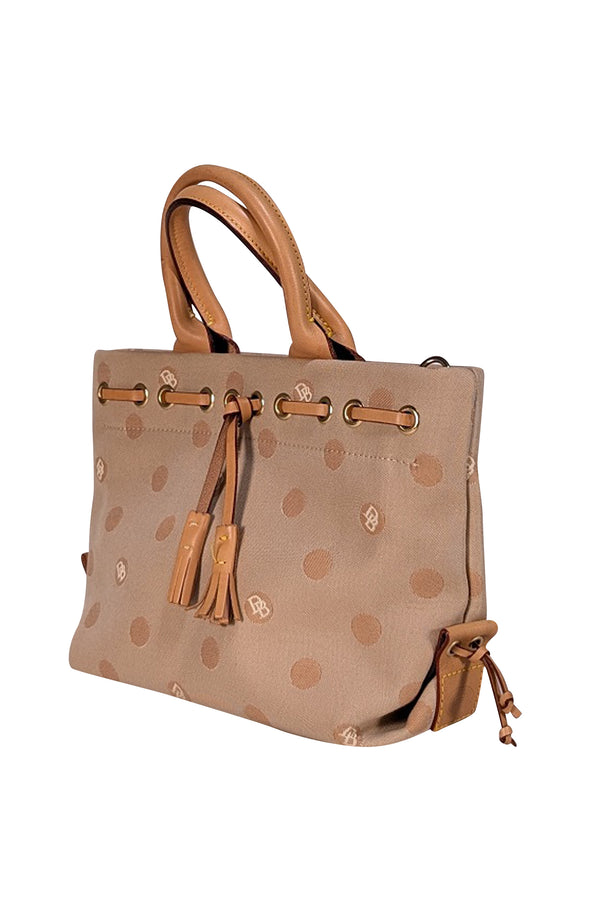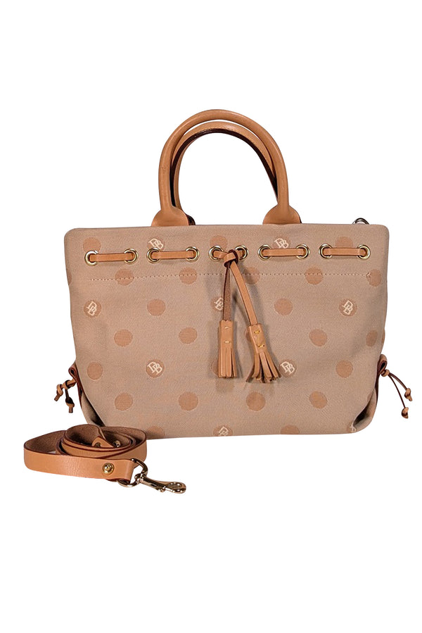 Dooney & Bourke beige canvas satchel bag features a playful monogram polka dot print and a convenient drawstring detail for easy access. With a detachable long strap, it offers versatile wear options while keeping a minimalist chic vibe perfect for everyday adventures.