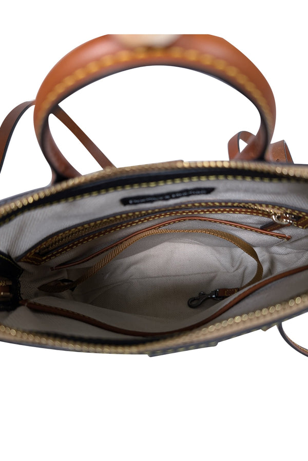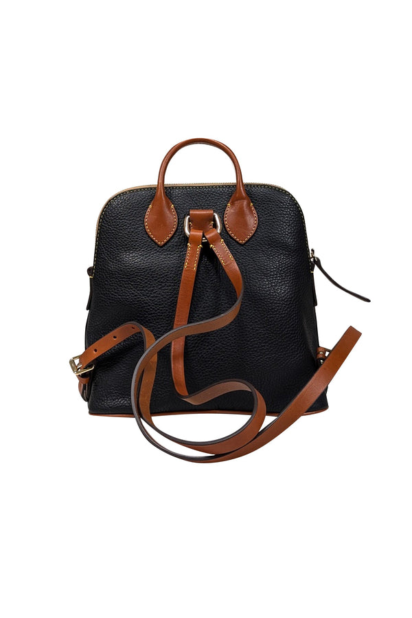 Upgrade your fall wardrobe with the Dooney & Bourke Black Leather Backpack. Crafted from high-quality black leather with tan trims and straps, this backpack offers timeless style and durability. Perfect for adding a touch of sophistication to any outfit.