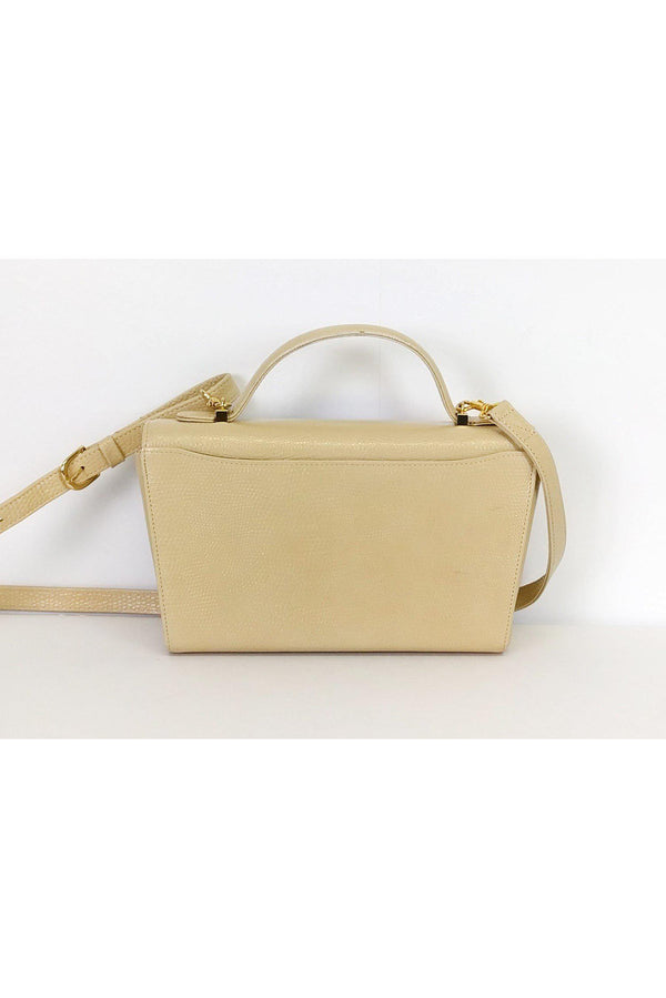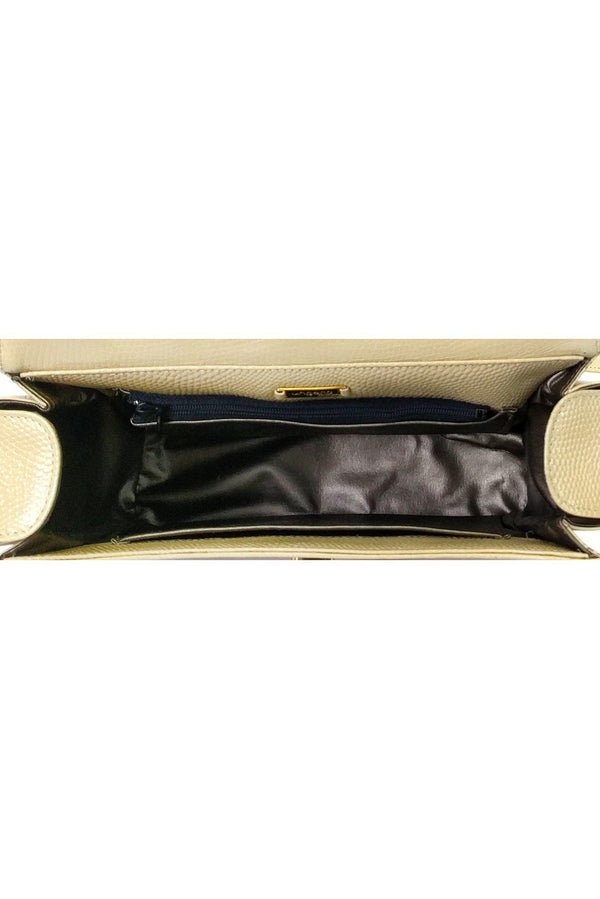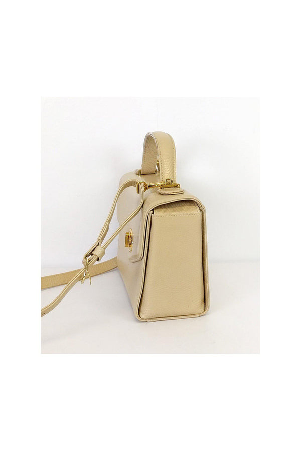 This structured handbag has a textured leather with gold-tone accents. The perfect day bag, it has a detachable crossbody strap for versatility.