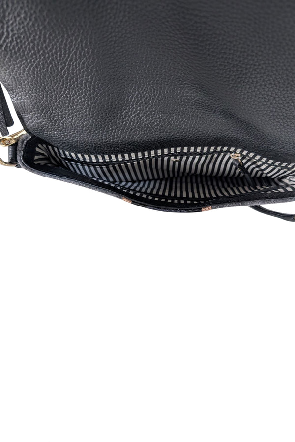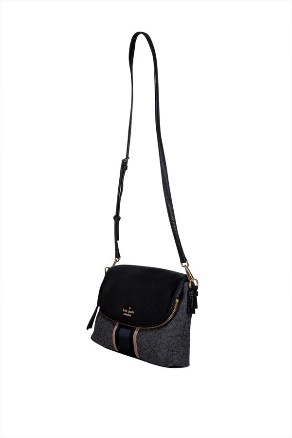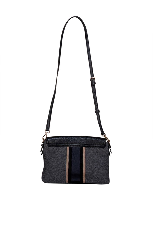 Refresh your seasonal style with this Kate Spade crossbody bag, featuring a sophisticated combination of grey and black leather paired with knit accents. The front flap closure ensures your belongings stay secure, while a navy blue center stripe delivers understated elegance. Designed for versatility, this bag seamlessly complements any occasion, making it an indispensable accessory for carrying your daily essentials in timeless comfort.