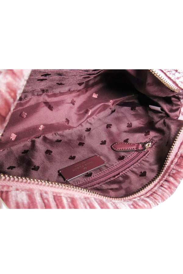 Introducing this adorable Kate Spade pink crushed velvet baguette shoulder bag; a dreamy addition to your wardrobe. The pretty pink crushed velvet adds a touch of nostalgia while the baguette style keeps you fashion-forward. Perfect for any Barbie enthusiast or anyone looking for a pop of color in their ensemble!