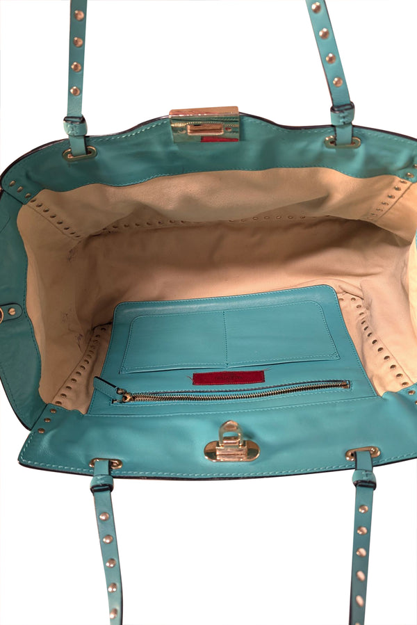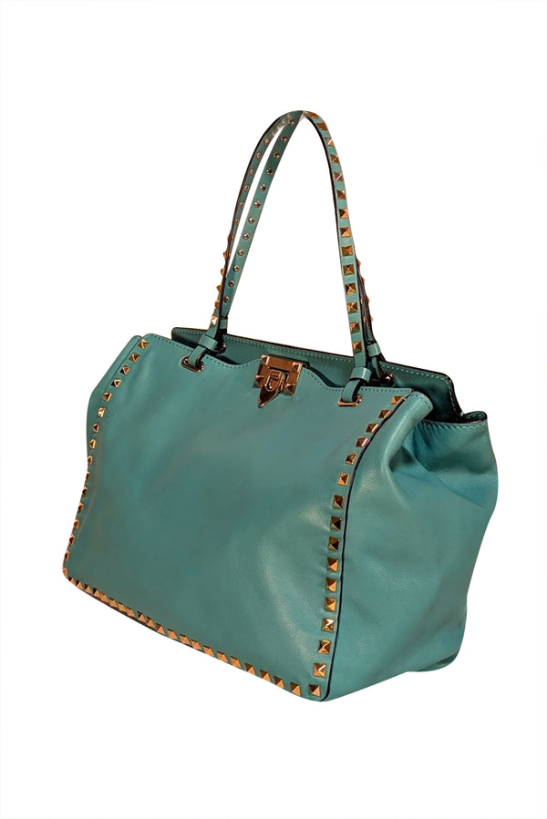Meet your new go-to bag with Italian flair. This Valentino teal green leather satchel brings the perfect blend of edge and elegance with its studded trim detailing. Handcrafted in Italy, it’s built to turn heads and handle your daily adventures with style. The rich jewel tone pairs effortlessly with any wardrobe, while the structured silhouette keeps everything organized. Carry it with confidence; this is the bag that makes every outfit feel intentional and chic.
